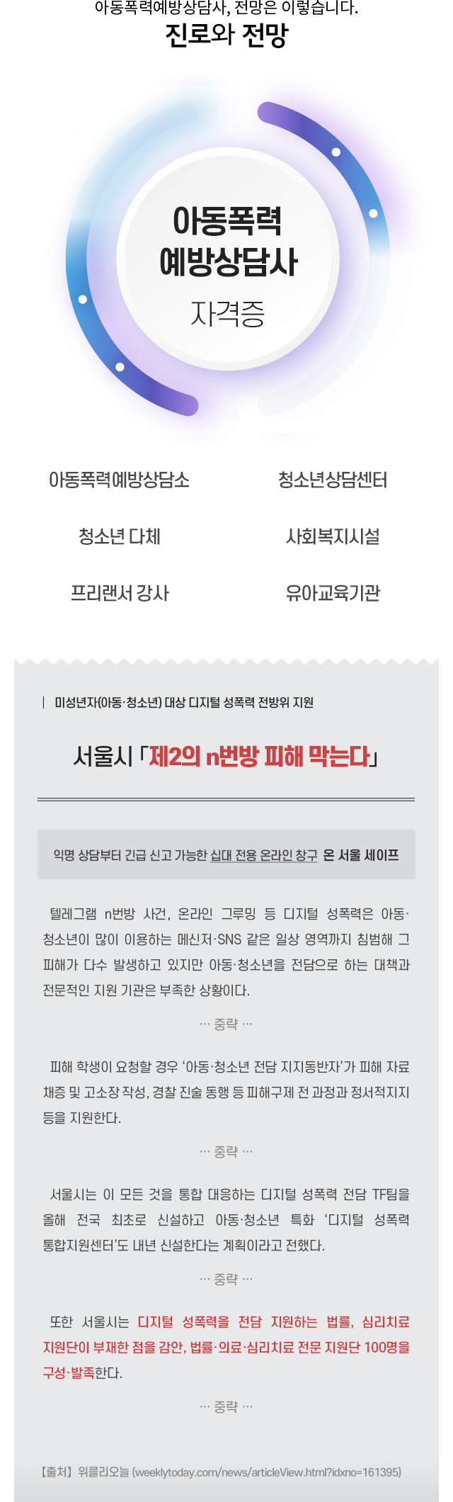¾Æµ¿Æø·Â¿¹¹æ»ó´ã»ç Ȱµ¿À» À§ÇÑ ÀÚ°ÝÃëµæ°úÁ¤À» ÅëÇØ Çб³Æø·ÂÀÇ °³³äÀ̷аú Áö½ÄÀ» ½ÀµæÇϰí, ´Ù¾çÇÑ Áý´Ü»ó´ã ÇÁ·Î±×·¥À» ÅëÇÑ È°¿ë¹æ¹ýÀ» üµæ½ÃÄÑ ¾Æµ¿Æø·Â¿¹¹æ»ó´ã»ç·Î¼ÀÇ ±âÃÊÀûÀÎ Á÷¹«¼öÇà ´É·ÂÀ» ¹è¾çÇÏ´Â °ÍÀ» ¸ñÇ¥·Î ÇÕ´Ï´Ù.