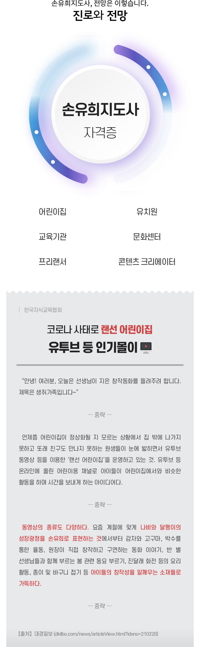 ¼ÕÀ¯ÈñÁöµµ»ç Ȱµ¿À» À§ÇØ ³îÀÌÄ¡·á±³À°ÀÇ À̷аú Áö½ÄÀ» ½ÀµæÇϰí, ¾Æµ¿¿¡°Ô ¿©·¯ °¡Áö °³³ä Çü¼ºÀ» µµ¿Í ÀÎÁö ±â´ÉÀÇ ±âÃʸ¦ ´ÙÁú ¼ö ÀÖ´Â °úÁ¤À» ¹è¿ö ¼ÕÀ¯ÈñÁöµµ»ç·Î¼ÀÇ ±âÃÊÀûÀÎ Á÷¹«¼öÇà ´É·ÂÀ» ¹è¾çÇÏ´Â °ÍÀ» ¸ñÇ¥·Î ÇÕ´Ï´Ù.
