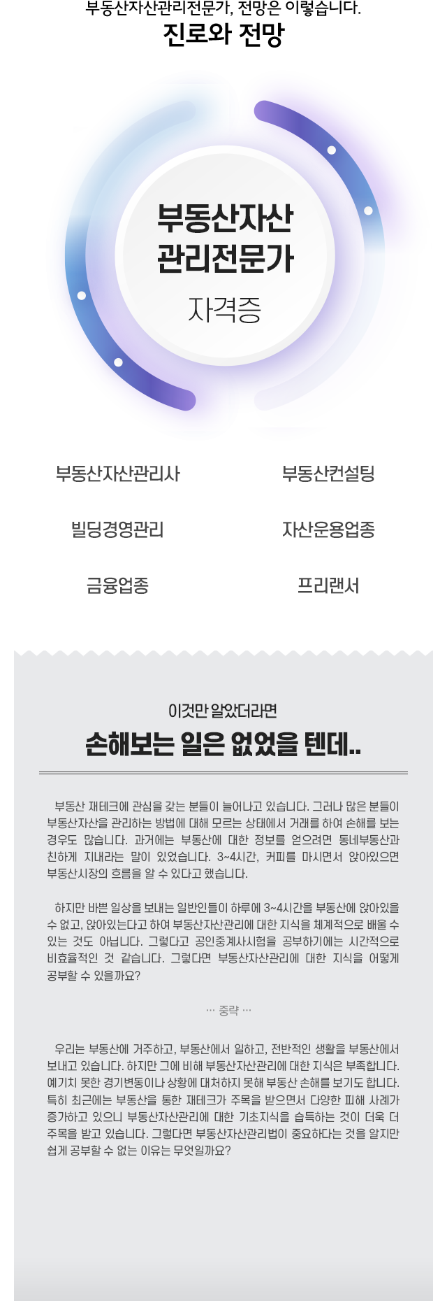 • ºÎµ¿»êÀÚ»ê°ü¸®Àü¹®°¡´Â ¼Ò±ØÀû Àǹ̿¡¼­ ºÎµ¿»êÀÇ ¿î¿µÀ̳ª À¯Áö¿¡ ¼Ò¿äµÇ´Â ºñ¿ëÀ» ÃÖ¼ÒÈ­ÇÏ´Â È¿À²ÀûÀÎ °ü¸®¸¦ ÀǹÌÇϰí, Àû±ØÀûÀ¸·Î´Â ºÎµ¿»êÀÇ Ãëµæ, º¸À¯, ¸Å°¢ µî ºÎµ¿»ê Ȱµ¿ÀÇ ´Ü°è¿¡¼­ À§ÇèºÐ»ê, Æ÷Æ®Æú¸®¿À ±¸¼º µîÀ» ÅëÇØ ºÎµ¿»ê ¼ÒÀ¯ÀÚÀÇ Àç»êÀû °¡Ä¡¿Í ¼öÀͼºÀ» ±Ø´ëÈ­Çϱâ À§ÇÑ Àü¹®ÀûÀ̰í Á¾ÇÕÀûÀÎ °ü¸®¸¦ ÀǹÌÇÑ´Ù.